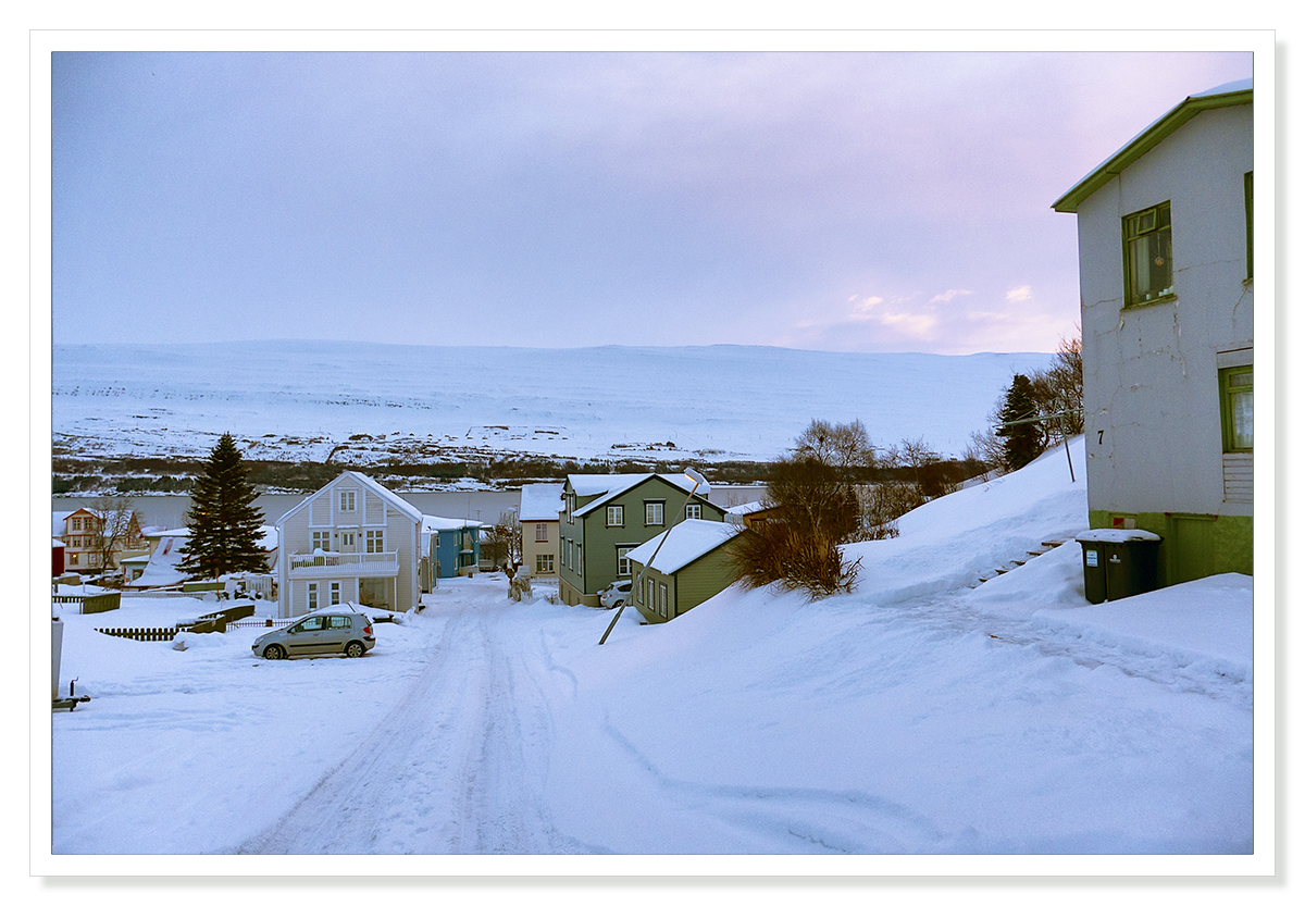 Continuing on from my last post, we entered the tunnel under the mountain that would bring us to the next fjord along, in a real blizzard. As we emerged from the tunnel on the other side of the mountains, it was still snowing just as hard, if not harder and as we entered the town of Siglufjörður where we saw the northern lights on our previous visit , the snow was piled either side of the road, and outside the houses. It was difficult to see but we pulled in to the car park of a convenience store. People were scurrying in and out of the shop, bundled against the snow. It was clear what a difficult winter the people living in the north of Iceland were having. We picked up a few snacks and pressed on. It was late in the afternoon and we wanted to check in to our apartment before dark.