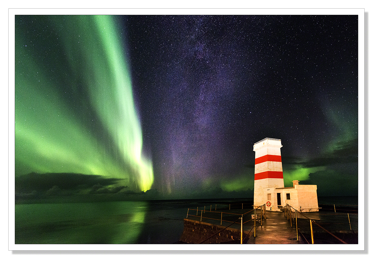 It rained all the way to Keflavik, it was only as I pulled into Gardur that the rain appeared to be stopping. I drove through a town all tucked up for the night to the lighthouse and daymark where, not surprisingly, I found several photographers with tripods set and looking skyward hopefully.