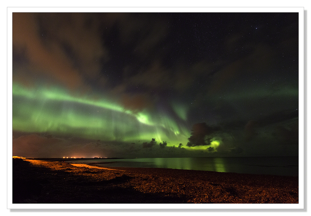 I couldn’t get near the daymark for the other photographers so I set up on the beach and waited. It wasn’t long before the clouds thinned and I could see stars. Shortly thereafter, I was witness to one of nature’s most mesmerizing light shows. It started quite gently, just along the beach..