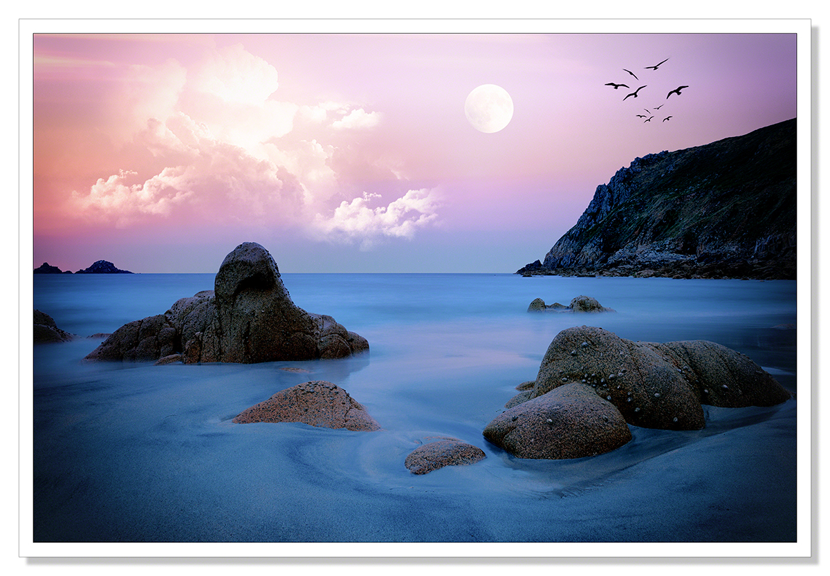 To make the image below, I took one of the two original photographs.  I then went through my archives digging out photographs with really nice clouds in them as well as photos with birds.  I then created some Photoshop brushes, quite a simple process for which there are many tutorials, and ‘painted’ the clouds and the birds onto the image.  The moon was added in exactly the same way.  You don’t need to make your own brushes of course.  There are many out there freely available but I wanted to work with elements added from my own photographs.  I then spent some time with gradient maps, adjustment layers, luminosity masks and rendered lighting effects to create just the atmosphere I wanted.