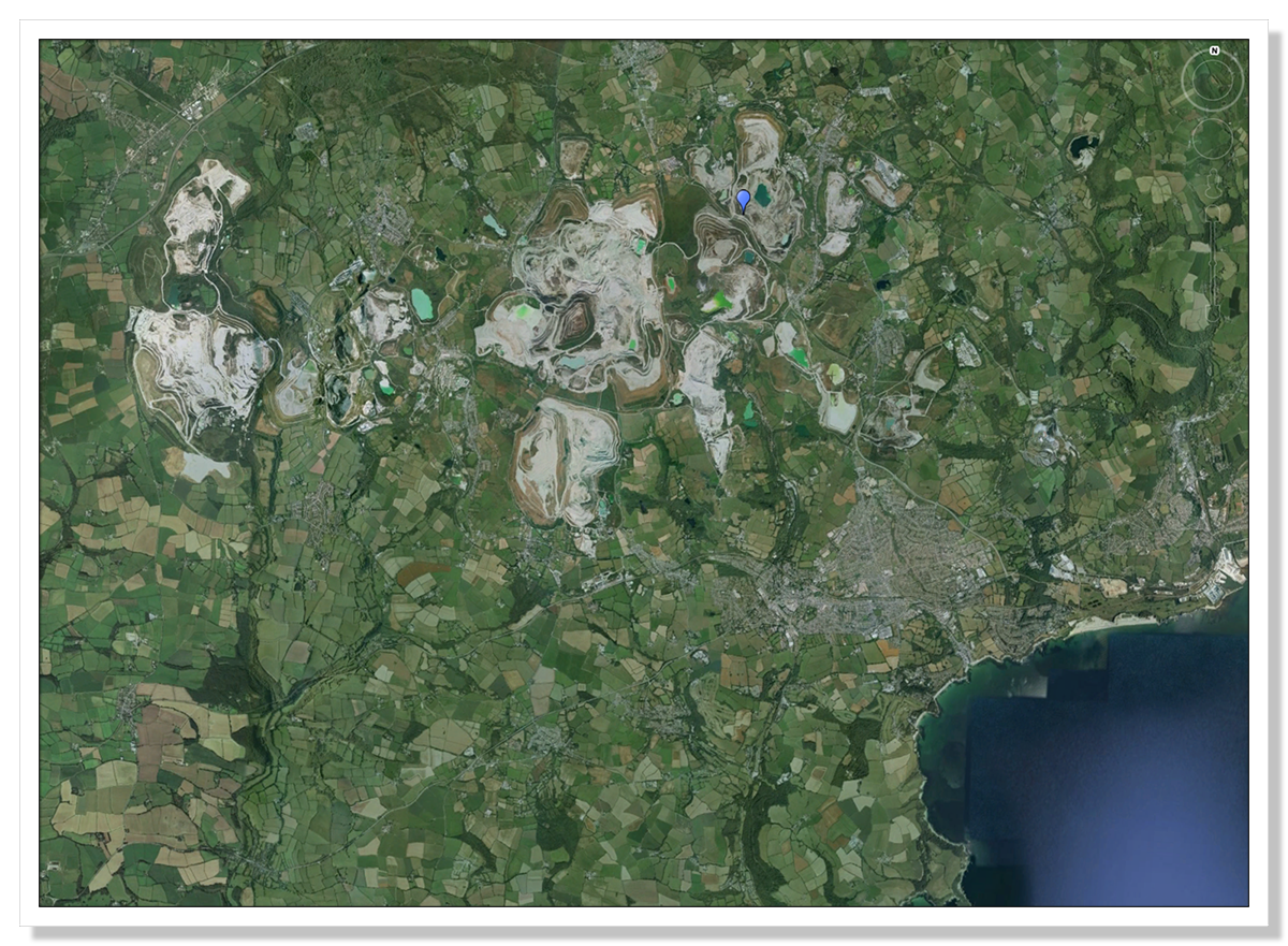 These are some of the biggest deposits of the best quality china clay (Kaolin) in the world and as the aerial photograph from Google Earth below shows, the workings are extensive. Visible from space these white scars on the landscape remain hidden from the ground for the most part due to very careful management and ‘Greening’ of the landscape following the extraction of the clay.