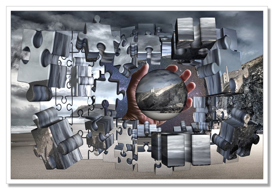 Sometimes it’s just fun to see where things can go with a photograph.  This is one of my most sucessful images turned into a jigsaw then blown apart using the 3D tools available within Photoshop to reveal the gem of the photograph, within a globe, and with a photograph of the Milky Way I took behind.  I had to photograph my own hand and then isolate it to create the illusion of the hand holding the globe.  Why, well why not?  For those curious, this is the engine house used in the opening titles to Poldark.