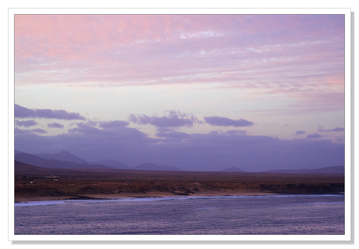 This picture was taken at dawn this morning from the small fishing village of El Cotillo, looking south along the coast to the mountains, the extinct volcanoes that form the back bone of these islands.
